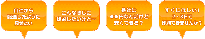 目指すのは「あなたの側の相談できる印刷通販」 通常の印刷通販では難しい、ちょっとしたわからないこともをお気軽にご質問いただけます。さらに他社と比較した指値や、お急ぎの場合の納期のご相談など、さまざまなご要望をご相談いただけます。 また、「イメージはこんな感じ…」「こんな感じに印刷したいんだけど…」などのご質問に対しては印刷のプロとしてのご提案も可能です。