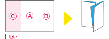 紙面の短編をセンター折り、長編を内側に3つに折る加工。内側となるC辺のみ2~3mm短く作成します。
